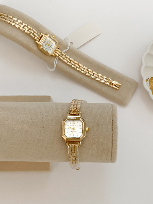 ساعت زنانه طلایی برند FENCCI با طراحی مینیمال و بند استیل طلایی براق. صفحه هشتضلعی خاص و ظریف که جلوهای لوکس و زنانه دارد. سبک و راحت برای استفاده روزانه و مهمانیها